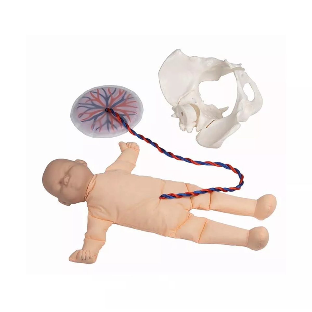 หุ่นเชิงกรานเพศหญิงพร้อมทารกสาธิตการคลอด จำลองกระดูกเชิงกรานผู้หญิง พร้อมหุ่นจำลองทารกในครรภ์ขนาดเท่าของจริง ทำจากผ้า (ส่วนหัวทำจากพลาสติก) ส่วนหัวสามารถคลำได้ มีสายสะดือและรก เหมาะสำหรับการจำลองกระบวนการคลอดบุตร