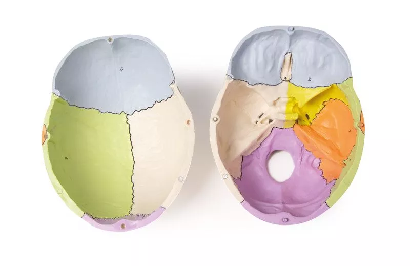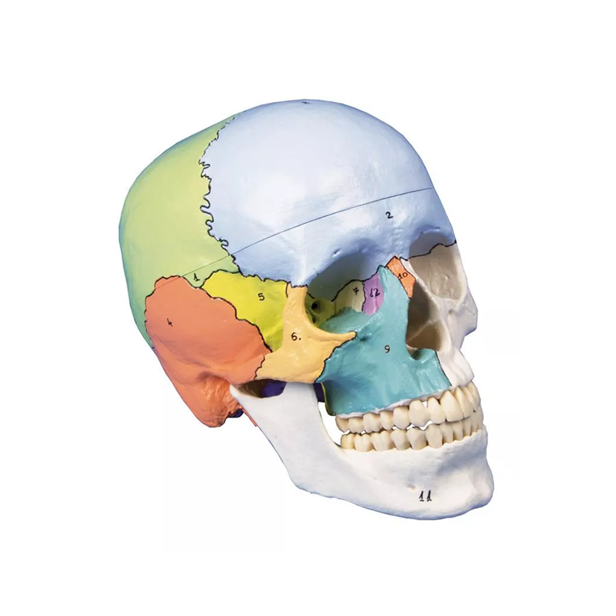 หุ่นจำลองกะโหลกศีรษะมนุษย์ แยกชิ้นส่วนได้ 3 ชิ้น ประกอบด้วย ฝาครอบกะโหลก ฐานกะโหลก และขากรรไกรล่าง สามารถเปิดและถอดออกได้ มีฟันและโครงสร้างถูกต้องตามหลักกายวิภาค ช่วยให้เข้าใจถึงรูปร่างและตำแหน่งของกะโหลกศีรษะได้อย่างชัดเจนผ่านการแบ่งแยกสีสัน