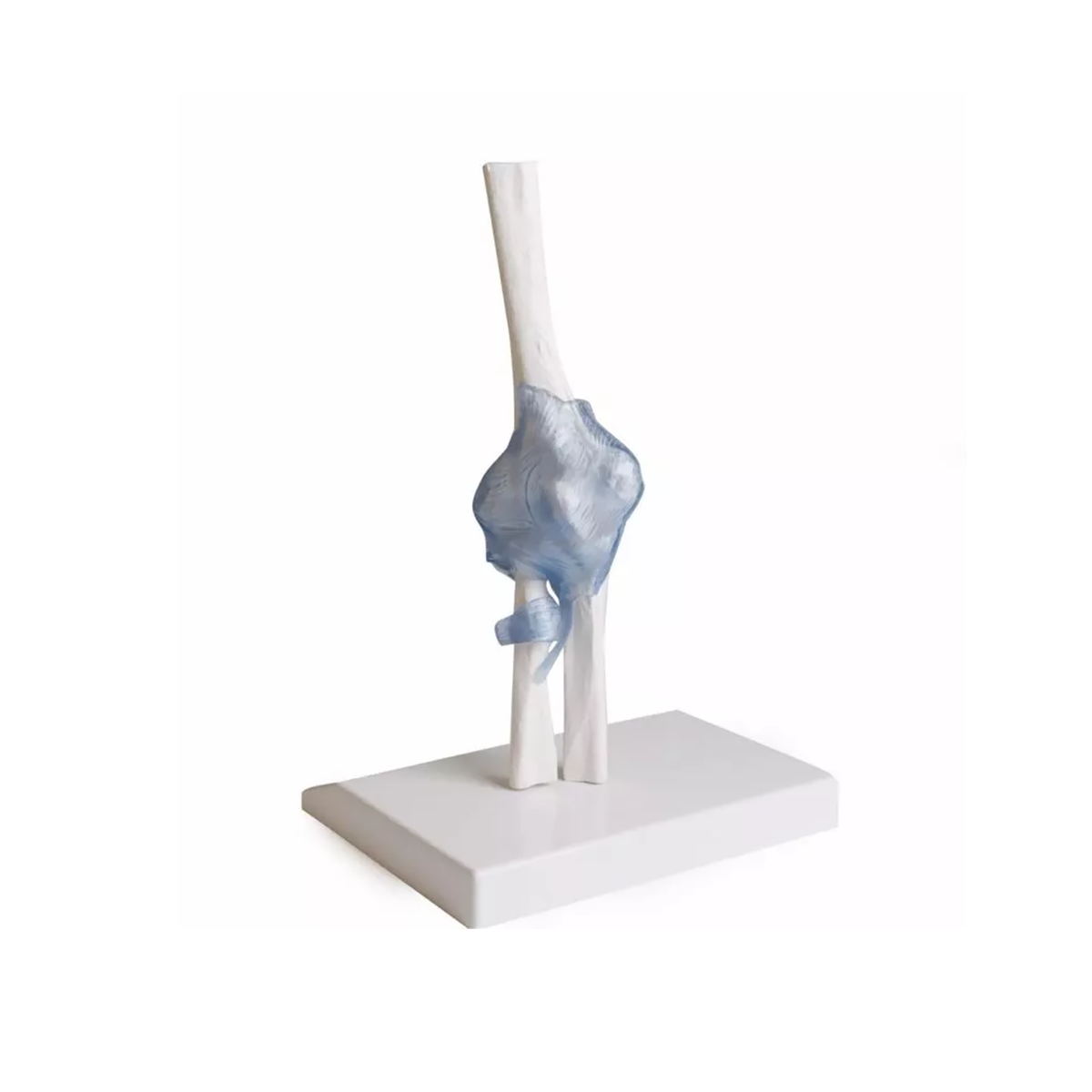 หุ่นจำลองโครงกระดูกข้อศอก แบบยืดหยุ่นพร้อมเอ็นยึดหุ่นจำลองโครงกระดูกข้อศอก แบบยืดหยุ่นพร้อมเอ็นยึด ขนาดเท่าของจริง ทำจากวัสดุยืดหยุ่นช่วยให้สามารถสาธิตการเคลื่อนไหวได้
