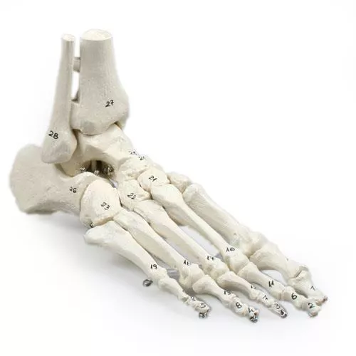 แบบจำลองกระดูกเท้าและข้อเท้ามนุษย์ พร้อมจุดยึดของกระดูกหน้าแข้งและกระดูกน่อง เท้าสามารถเคลื่อนไหวได้ ติดตั้งบนฐานพร้อมหมายเลขกำกับบนกระดูก จำลองการเคลื่อนไหวของข้อเท้าและเท้าได้
